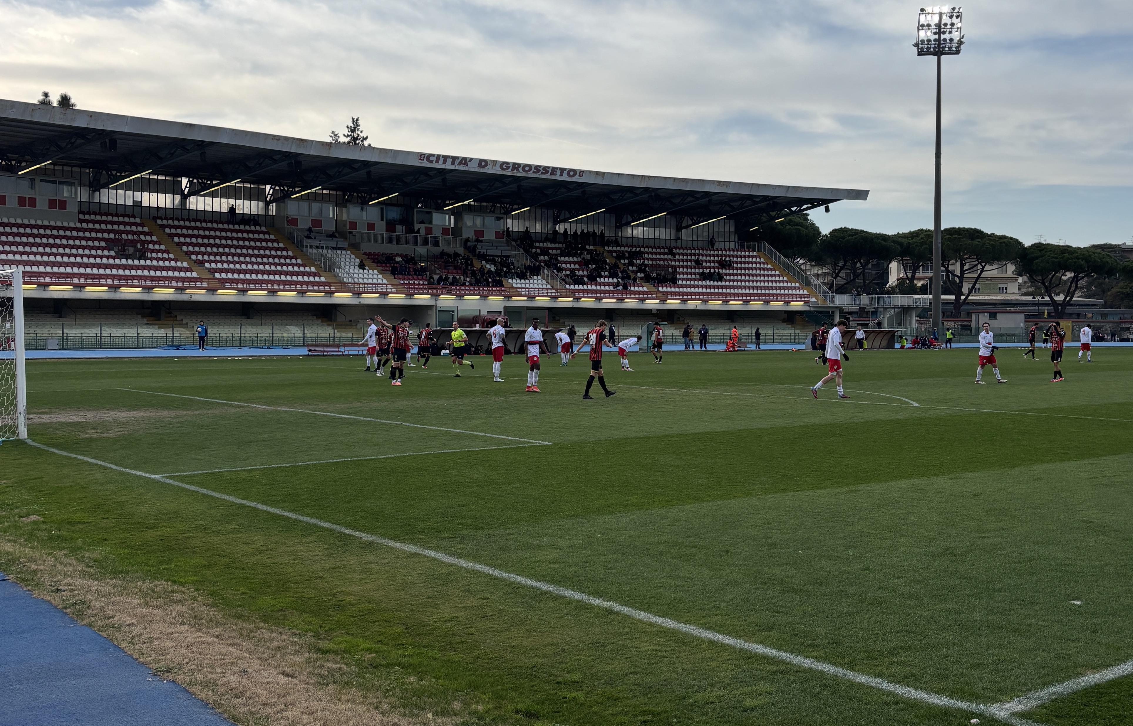 L'avvio è dei padroni di casa che si vedono regalare una punizione dall'arbitro (c'era invece fallo su Santeramo) e sulla conseguente mischia inn area Borboryo cicca il tap in. La Lucchese stenta ad entrare in partita, e al 12' serve il miglior Milan per evitare il vantaggio dei grossetani con Blanchard che calibra un preciso colpo di testa. La risposta è affidata ad un diagonale di Piazze che termina sul fondo tre minuti dopo. Al 24' Lorenzini prova un tiro cross che sorprende Pini: il portiere para con difficoltà sulla linea di porta. Al 28' è Palma a non trovare la coordinazione giusta a due passi dalla porta. Poi più nulla da segnalare se non un predominio sterile dei rossoneri sino al duplice fischio con i padroni di casa che si limita a giocare di rimessa.