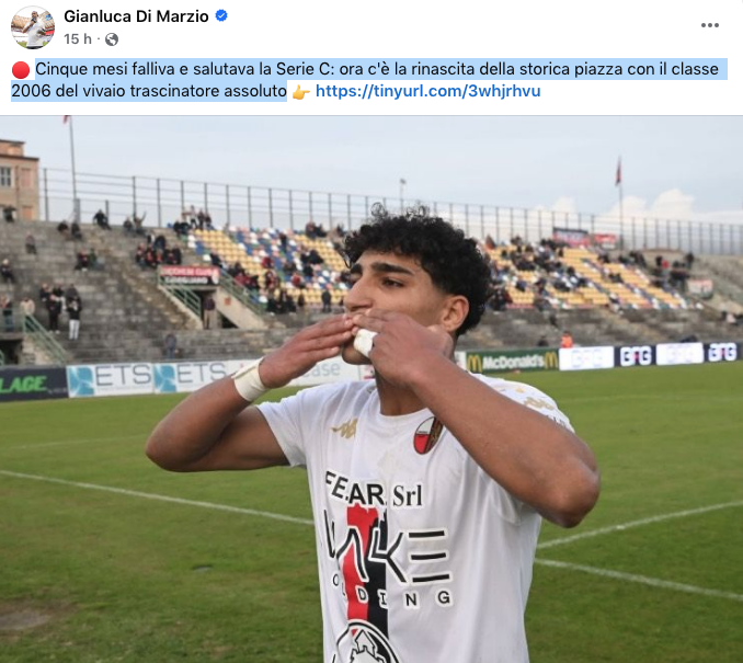 "Cinque mesi fa – scrive Di Marzio. – falliva e salutava la Serie C: ora c'è la rinascita della storica piazza con il classe 2006 del vivaio trascinatore assoluto". Il classe 2006 è ovviamente l'attaccante Riad che con i suoi gol ha contribuito a portare la Lucchese prima in classifica.