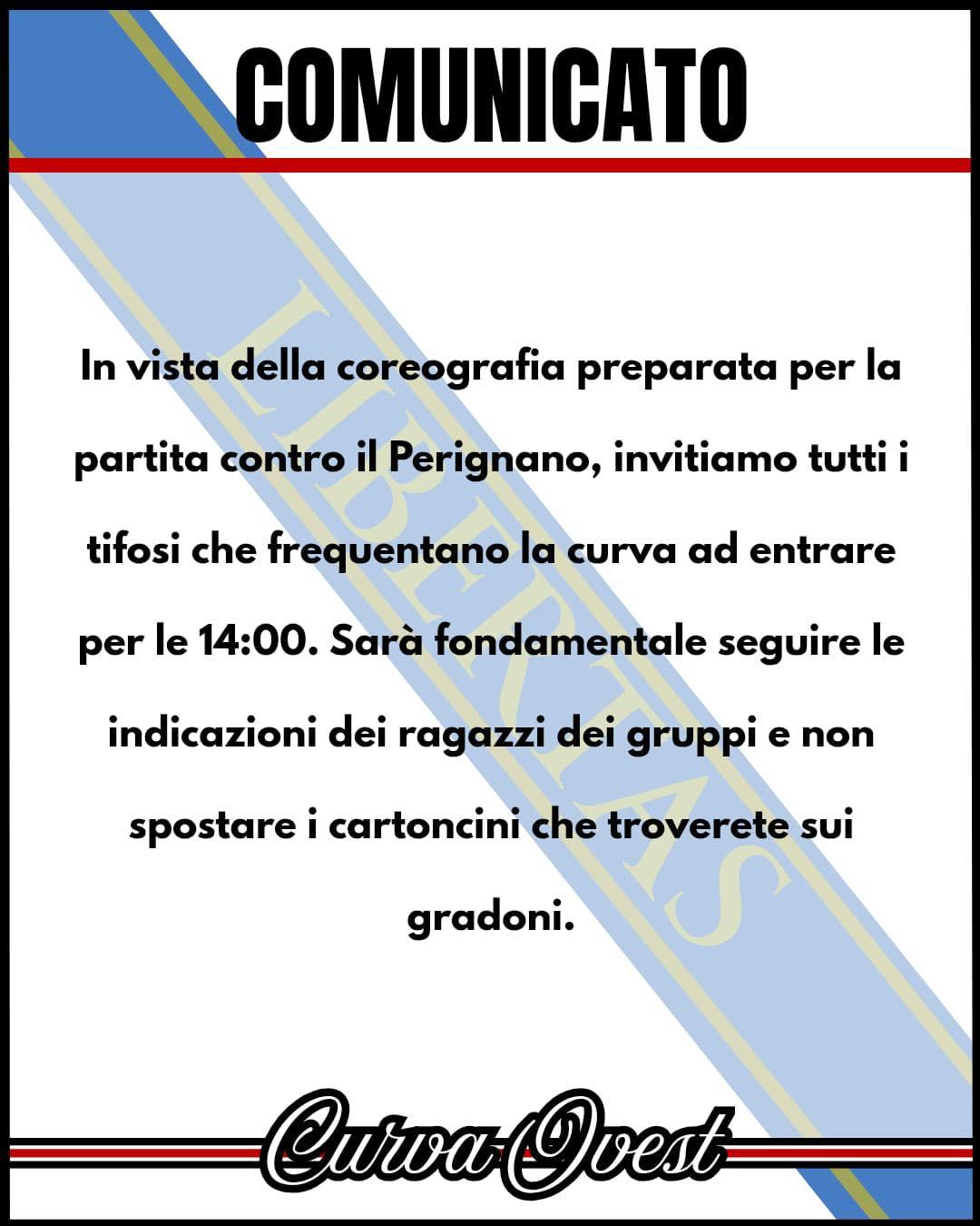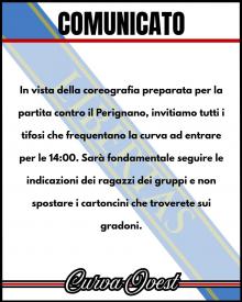 "La partita di domenica – si legge sul profilo Fuori la voce – come tutti sappiamo è di fondamentale importanza. È per questo e per l’instancabile passione per Lucca e la sua squadra che i ragazzi della Ovest hanno organizzato una coreografia. Per la riuscita del tutto, ecco le indicazioni che tutti dovranno seguire: Consigliamo vivamente a tutti coloro che dovranno acquistare il biglietto, di farlo in prevendita, così da evitare inutili file e ingorghi ai botteghini e al prefiltraggio. Al fine della riuscita della coreografia sarà fondamentale il posizionamento di ogni persona, per questo ogni tifoso rossonero dovrà entrare almeno un ora prima in curva, cioè alle 14. La curva sarà divisa in varie fasce con del fettucciato, ogni tifoso dovrà stare all’interno di quest’ultimo. I cartoncini che troverete per terra NON VANNO SPOSTATI, ogni cartoncino rappresenta una postazione per una persona. Per ogni altra indicazione, ascoltate e collaborate con i soliti ragazzi che coordineranno il tutto.Facciamo vedere ancora una volta quanto è alto l’orgoglio di combattere per Lucca e per i suoi colori! TUTTI IN CURVA!".