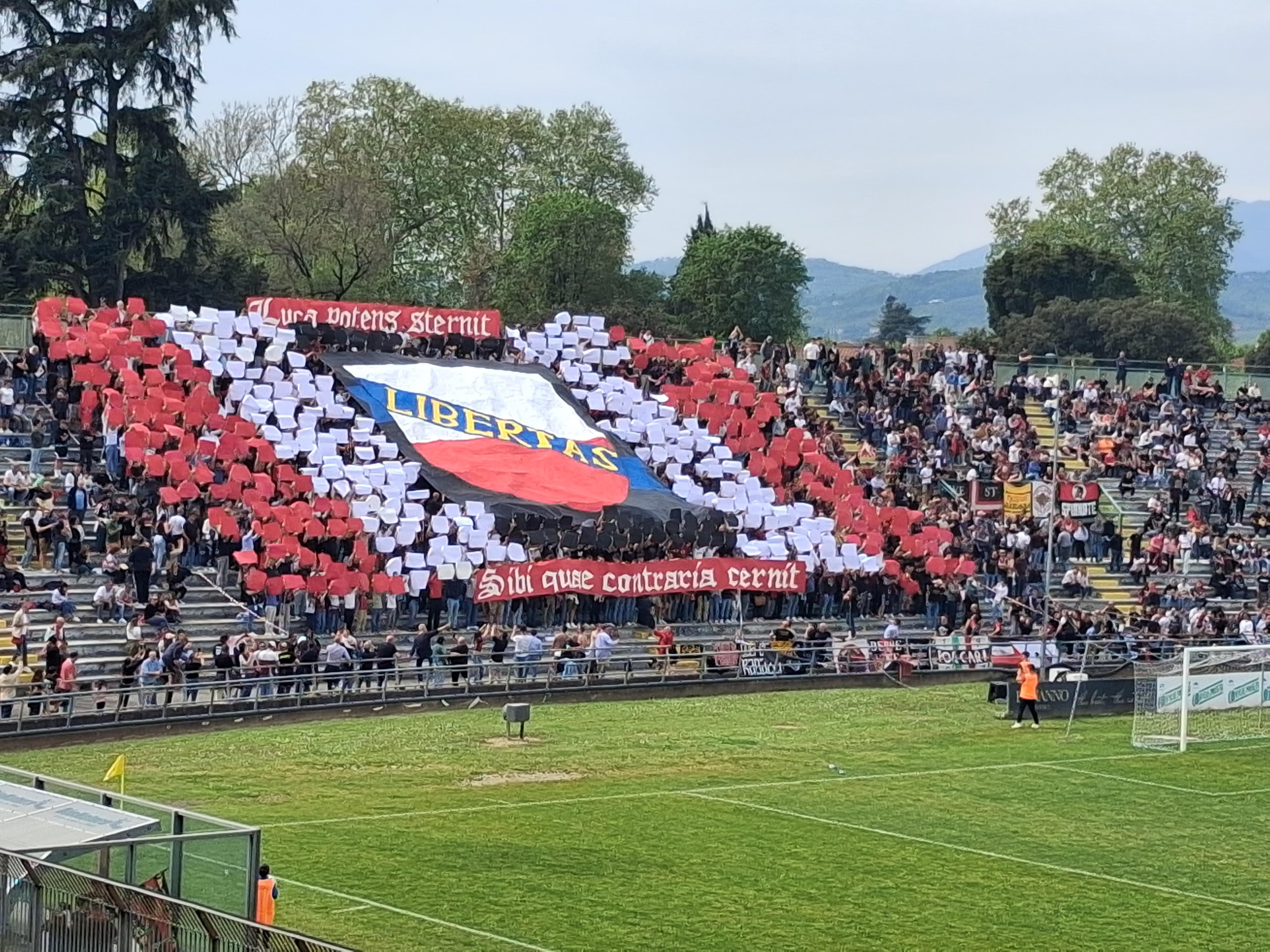 E' stata una caccia al biglietti iniziata sin da giovedì scorso con una progressione impressionante negli acquisti dei tagliandi sino ad arrivare alle 3502 presenze. Numeri, inutile dirlo, da categoria superiore (e non una), numeri che lo scorso anno in Serie C furono superati soltanto per lo spareggio drammatico contro il Sestri Levante. Ma lo spettacolo nello spettacolo a inizio gara, quando la Curva Ovest (esaurita nei posti disponibili, ovvero 2000) ha dato vita a una fantastica scenografica fatta da un megatelone riportante lo storico stemma della Repubblica di Lucca con su scritto “Libertas”. Ai lati cartoncini bianchi e rossi, ovvero i colori della città, sotto la scritta in latino “Luca potens sternit, sibi quae contraria cernit” srolotolato con il sottofondo emozionante de “Il mio canto libero” dell'intramontabile Lucio Battisti.