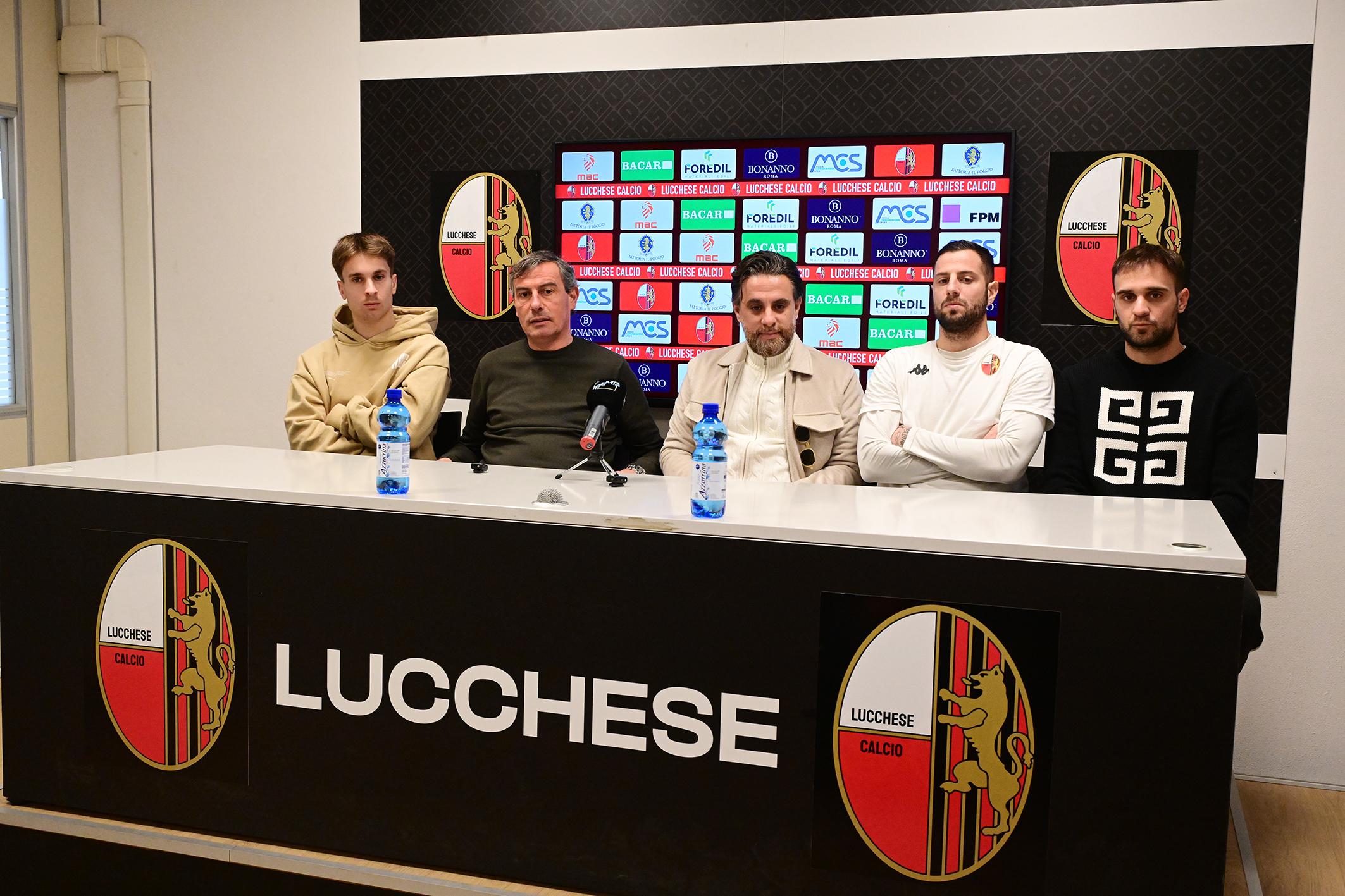 A presentare i nuovi acquisti nella sala stampa del Porta Elisa, il patron Matteo Brunori e il direttore generale Andrea Gianni che ha preso per primo la parola: "Era doveroso convocare una conferenza stampa per spiegare il nostro percorso in questo mercato. Il mercato di riparazione è sempre un po' particolare perché deve incidere nell'alzare l'asticella delle ambizioni della proprietà, dell'allenatore e di una piazza importante come Lucca. Grazie al nostro patron, si sono create le condizioni per portare dei giocatori di categoria superiore che possono darci una grande mano e essere importanti. I tre nuovi acquisti sono già a disposizione e hanno già svolto il primo allenamento. Sono uno per reparto e servivano per fare un salto di qualità e completano gli innesti di Camilli e Colferati. Abbiamo avuto l'intuizione di prendere giocatori vogliosi di venire a Lucca, avesse le capacità tecniche necessarie ma anche capisse l'ambizione di questa società dimostrata anche in questo frangente. Giocatori in uscita? Abbiamo pensato a inserire le pedine, poi ci sarà una riunione con presidente e mister per capire se tutti sono necessari al progetto: non vogliamo lasciare nulla al caso. Ora siamo i favoriti? Quando siamo partiti eravamo dati terzi, quarti, quinti poi con il lavoro quotidiano di tutti, nessuno escluso, siamo primi in classifica. Abbiamo innestato qualità ma non dimentichiamo i sacrifici che ci hanno portato a essere primi".