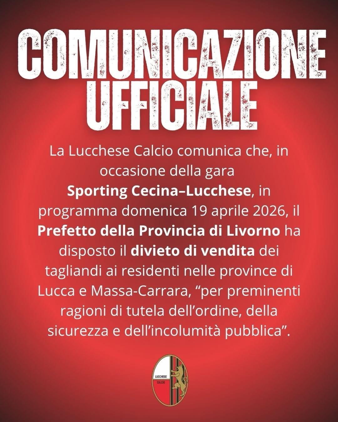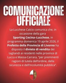 Niente tifosi rossoneri nemmeno a Cecina: la prefettura di Livorno ha vietato “per preminenti ragioni di tutela dell’ordine, della sicurezza e dell’incolumità pubblica” la trasferta di domenica prossima dopo aver bloccato nei mesi scorsi quella con la Pro Livorno.